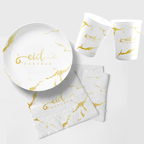 Eid Mubarak Plate, Cup and Napkin Set - White & Gold Marble